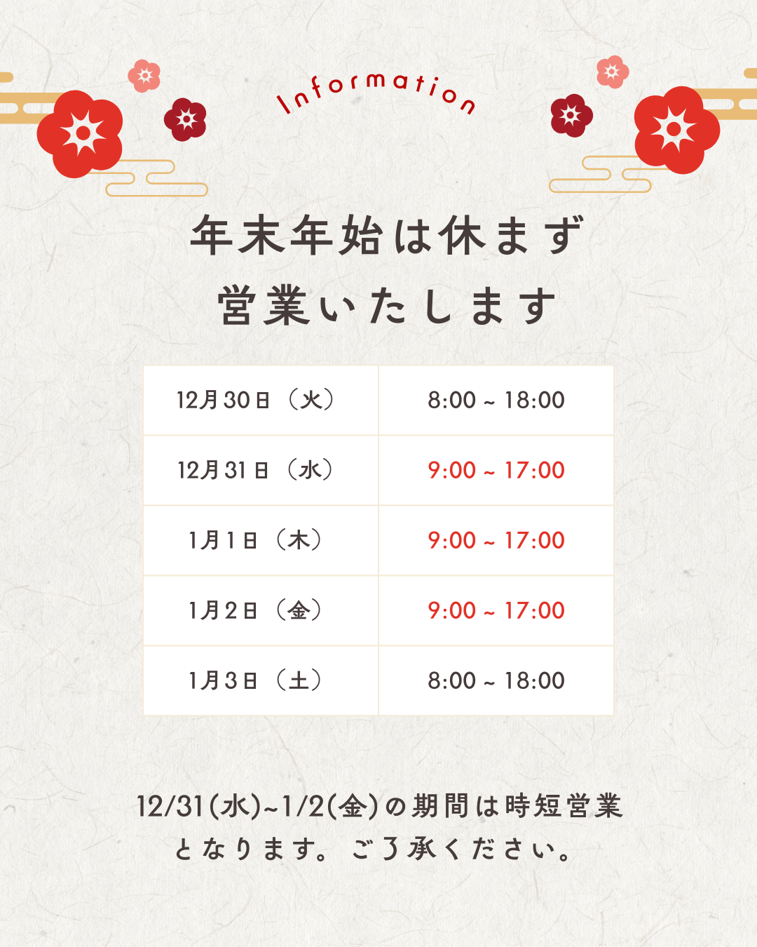 12/31(土)~1/2(月)は営業時間が変更となりますのでご了承下さいませ。